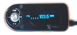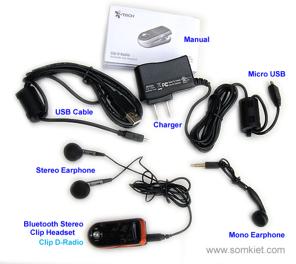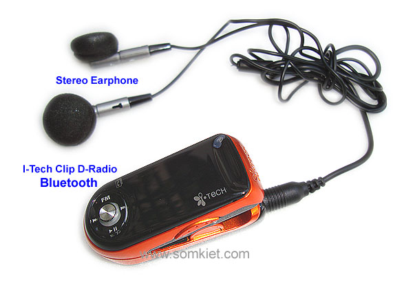FM ได้ด้วย นั้น มีขาย หลายยี่ห้อแล้ว เช่น Nokia, Motorola, Energy และของ I-Tech เป็นต้น ซึ่งจากการใช้งาน Bluetooth แบบที่รับวิทยุ FM ได้ด้วยนั้น ได้ทำเฉพาะของ Energy รุ่น BTM-118 และของ I-Tech รุ่น Clip D-Radio โดยที่ทั้ง 2 แบบ มี ราคาต่างกันมาก คือ Energy รุ่ย BTM-118 มีราคาประมาณ 1,500 บาท และ I-Tech รุ่น D-Radio มีราคาประมาณ 3,700 - 3,990 บาท ส่วนของ Nokia รุ่น BH-903 นั้น มี Features ต่างๆที่เหนือกว่า แต่ราคาก็ประมาณ 7,700 บาท เครื่องบลูทูธ I-Tech D-Radio นั้น มีอุปกรณ์ต่างๆให้มาครบ (ตามรูปที่ 2) และเครื่องมี Specifications ดังนี้ Bluetooth v2.1+ EDR Class2 Bluetooth Profiles : HSP / HFP / A2DP / AVRCP ความถี่ 2.4 GHz ISM Band ความถี่ FM 87.5 - 108 MHz ระยะใช้งาน 10 เมตร (แต่โดยทั่วๆไป ระยะไม่ควรเกิน 5 เมตร) Standby Time 150 ชั่วโมง เวลาพูด / เวลาฟังเพลง 7 ชั่วโมง แบตเตอรี่ 3.7 โวลท์ Li-Polymer Rechargeable ขนาด 53 (L) x 24 (W) x 26 (H) mm. น้ำหนัก 21.5 กรัม Features ที่น่าสนใจ คือ 1. หน้าจอ OLED โชว์เบอร์โทรเข้า โทรออก เบอร์ที่ไม่ได้ รับสาย และ ช่องสถานี 2. บลูทูชแบบสเตอริโอ สามารถสลับฟังเพลง และ รับสาย ได้อัตโนมัติ 3. มี Built-in FM Radio 4. ค้นหาช่องสถานีอัตโนมัติ หรือ Manual 5. ตั้งช่องสถานีได้ 4 ช่องสถานี 6. สามารถฟัง FM ได้โดยไม่ต้องเชื่อมต่อกับโทรศัพท์มือถือ 7. มีเสียงเรียกเข้าให้เลือกได้ 3 แบบ ผลการใช้งาน การเชื่อมต่อกับโทรศัพท์มือถือทำได้ง่าย การฟังเพลงจาก โทรศัพท์มือถือ ให้เสียงที่ดีมากทั้งทุ้มและแหลม และมีความ ต่อเนื่องดี ไม่สะดุด ส่วนการรับฟังวิทยุ FM ก็ให้เสียงที่ชัด เจนดี นับว่าเป็นเครื่องที่น่าสนใจมาก ร้านค้าส่วนใหญ่ที่ ศูนย์การค้ามาบุญครองจะแนะนำเครื่องนี้