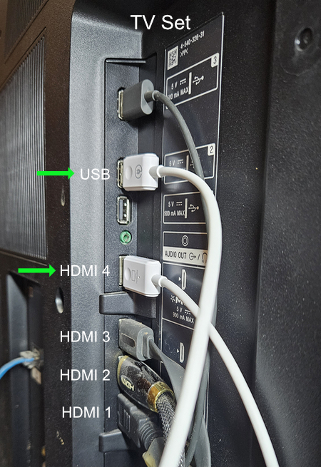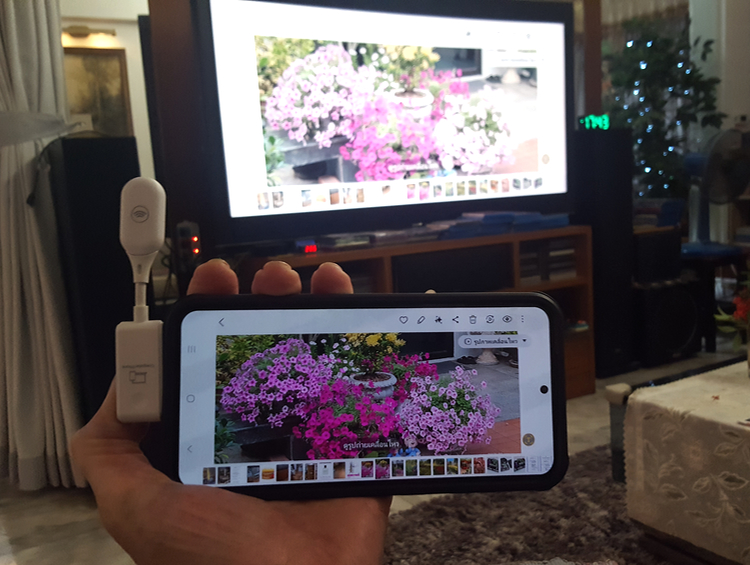 วิธีใช้ การใช้งานอุปกรณ์นี้ง่ายมาก ไม่ต้องติดตั้ง App. หรือทำการตั้งค่าใดๆ การใช้ทำดังนี้ 1. เสียบตัวรับสัญญาณเข้ากับทีวี โดยเสียบขั้ว HDMI เข้าที่พอร์ต HDMI และขั้วด้านที่เป็น USB เสียบเข้ากับพอร์ต USB ของทีวี เพื่อนำไฟไปจ่ายอุปกรณ์ รูปที่ 3 แสดงการต่อขั้ว HDMI เข้าที่ HDMI 4 และขั้ว USB เข้าที่ทีวี ตามลูกศรชี้ อนึ่ง ถ้าทีวีไม่มีพอร์ต USB ว่าง ก็สามารถเอาขั้ว USB นี้ไปเสียบเข้ากับหัวชาร์จโทรศัพท์มือถือได้ หรือหากจำเป็นจริงๆก็เสียบเข้ากับ Power Bank ก็ได้ หมายเหตุ : การทดสอบโดยใช้ Power Bank จ่ายไฟให้กับอุปกรณ์ตัวรับสัญญาณพบว่า ใช้ไฟฟ้าประมาณ 200 mA หรือ 1 วัตต์ ดังนั้น Power Bank ที่มี Output 5000 mAh จะจ่ายไฟได้ 25 ชั่วโมง 2. เสียบตัวส่งสัญญาณเข้ากับพอร์ต USB Type C ของโทรศัพท์มือถือ ตามรูปที่ 4 3. เปิดทีวี และเลือก Input เป็น HDMI 4 หรือ HDMI พอร์ตที่เสียบตัวรับสัญญาณไว้ และรอ จากนั้นจะปรากฏภาพจากหน้าจอโทรศัพท์มือถือไปขึ้นแสดงที่จอทีวี สามารถใช้งานได้ทันที |