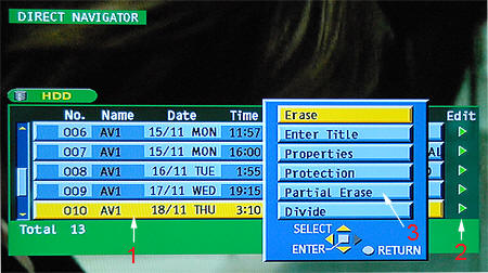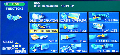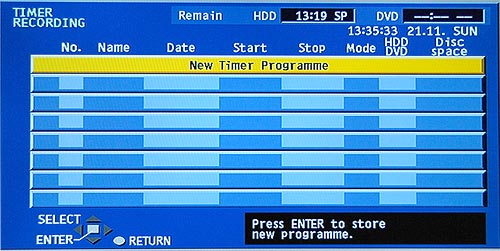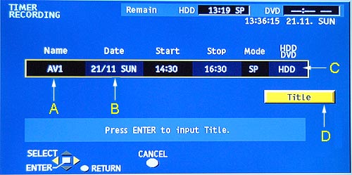 DMR-E100H ได้ออกมาขาย นานมาแล้ว และในปัจจุบันได้มีรุ่นใหม่ๆ ที่ HDD มีความจุถึง 320 GB ออกมาแทนก็ตาม แต่หลักการใช้งาน ก็คล้ายๆกัน ดังนั้น บทความนี้ จะเป็นการอธิบายให้ทราบถึงวิธีการ ใช้งานบางอย่างที่เป็นประโยชน์ สำหรับผู้ที่สนใจ การบันทึกรายการโทรทัศน์ แบบ Timer Recording เป็นการตั้งวัน เวลา ที่จะให้เครื่อง Panasonic DMR-E100H ทำการบันทึกรายการ โทรทัศน์ ลงใน Hard Disk Drive (HDD) หรือแผ่น DVD ได้โดยอัตโนมัติ ซึ่งทำ ให้สะดวก เมื่อไม่อยู่บ้าน หรือให้บันทึกรายการในช่วงดึกๆ แล้วมาเปิดดูในภายหลังได้ ![]() รูปที่ 8 การต่อสายสัญญาณเข้า DVD Recorder และ TV ตัวอย่างการต่อสายสัญญาณ ตามรูปที่ 8 เป็นการใช้ประโยชน์โดยนำสัญญาณจาก S-Video มาใช้เพื่อการบันทึกเข้าเครื่อง DVD Recorder และมีการต่อสัญญาณ ไปเข้า TV โดยใช้สาย Component Video ทำให้ได้ภาพที่ชัดเจนดี ในกรณีที่ แสดงนี้ เครื่อง DMR-E100H สามารถส่งผ่านสัญญาณภาพและเสียงจากรายการที่ รับชมโดย Satellite Receiver ไปยัง TV ได้ แม้ว่าจะไม่ทำการบันทึกรายการก็ตาม แต่ถ้าผู้ใช้ไม่ต้องการเปิดเครื่อง DVD Recorder ก็ต้องต่อสาย AV (RCA) โดย ตรงจาก Satellite Receiver ไปเข้าที่ TV แต่ภาพจะมีคุณภาพด้อยลงไป (ในการรับชมรายการ ที่ TV จะต้องเลือก Input ให้ถูกต้องด้วย ว่ามาจากแหล่งไหน เช่น ถ้าจะรับชมรายการที่ผ่านมาทางเครื่อง DVD Recorder ก็ต้องเลือก Input เป็น Component) หมายเหตุ : เครื่อง DVD Recorder DMR-E100H ขณะทำงาน ใช้ไฟฟ้าประมาณ 37 วัตต์ แต่ถ้าอยู่ใน Standby / Sleep Mode ใช้ไฟฟ้าเพียง 5 วัตต์ ขั้นตอนการบันทึกรายการแบบ Timer Recording มีดังนี้ : 1. กดปุ่ม Functions ที่ตัว Remote Control จะปรากฎเมนู ตาม รูปที่ 2 2. เลือก Timer Recorder กด Enter จะได้ New Timer Programme ตามรูปที่ 3 3. กด Enter เพื่อกำหนดค่าการตั้งบันทึกรายการ ตามรูปที่ 4 โดยเริ่มจากการเลือกแหล่ง สัญญาณเข้า (Input หรือ Name , A) เช่น AV1 ถ้าเป็นแหล่งสัญญาณวิดีโอที่มาจาก เครื่องรับดาวเทียม (Satellite Receiver) ซึ่งมีข้อแนะนำคือ ให้ทดลองเร่งเสียงให้ดัง มากพอ ทดลองบันทึกรายการตามปกติ แล้วเปิดฟังเสียงก่อนว่าดังพอหรือไม่ เมื่อรู้ระดับ เสียง Input ที่จะนำมาบันทึกรายการแบบ Timer Recording แล้ว ก็จะใช้เป็นหลักต่อไป จากนั้นเลื่อน Cursor ไปที่ B วันที่ เดือน และวัน จะปรากฎขึ้นเองโดยอัตโนมัติ จากนั้น เลื่อนไปตั้งเวลาที่จะเริ่มต้นการบันทึกคือ Start และเวลาที่จะยุติการบันทึก (Stop) แล้วเลือก โหมดการบันทึก เช่น ให้บันทีกแบบ SP (Standard Play) แล้วเลือกว่าจะให้บันทึกลง HDD หรือ DVD (C) จากนั้นเมื่อกด Cursor ไปทางขวา ก็จะเป็นการตั้งชื่อรายการ (Title, D) 4. การตั้งชื่อ หรือ Title นั้น ทำได้โดยใช้ Cursor ที่ Remote Control เลื่อนไปเลือก ตัวอักษรและตัวเลข แล้วกด Enter ไปเรื่อยๆ เมื่อเสร็จแล้ว ตามรูปที่ 5 และเมื่อกด Set จะได้ ตามรูปที่ 6 ซึ่งเมื่อกด Enter ค่าต่างๆก็จะถูก Store ไว้ในเครื่