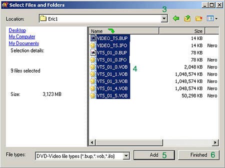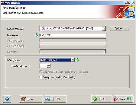 Copy DVD Movie เปิดโปรแกรม Nero StartSmart และเลือกใช้ Nero Express 6 และทำตามขั้นตอนดังนี้ 1. เลือก DVD Writer ไดร์ฟที่จะใช้ (1) 2. คลิกที่ DVD-Video Files 3. เลือกหา Folder ที่บรรจุข้อมูล DVD Files จากการที่ได้ Copy เอาไว้แล้วในเรื่อง DVD Decrypter 4. เลือกไฟล์ทั้งหมด 5. คลิก Add 6. ต่อจากนั้น คลิก Finished 7. ตามรูปที่ 3 คลิก Next 8. ตามรูปที่ 4 ตั้งชื่อ Disc (8) แล้วเลือก Writing Speed (9) ต่อจากนั้น คลิก Burn (10) 9. โปรแกรมจะทำการ Burn DVD จนเสร็จ ก็เลือก Exit นำแผ่นออกมาใช้ได้ หมายเหตุ การ Copy DVD ดังกล่าว ถ้าแผ่น DVD มีขนาด 4.7 GB แต่ไฟล์ DVD ต้นฉบับมีขนาดมากกว่า 4.7 GB ก็จะไม่สามารถทำการ Copy ได้ ดังนั้น จะต้องใช้โปรแกรมอื่นเข้ามาช่วยลดขนาดของไฟล์ DVD ต้นฉบับลง ได้แก่การใช้ NeroVision Express 2, Nero Recode โดยติดตั้ง Direct X 9.0c ไว้ด้วย อ่านเรื่อง ทดสอบการ Copying DVD 9 Movie |