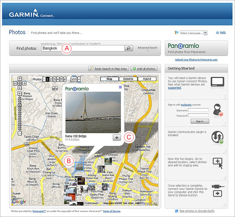 ... | บทความที่ควรอ่าน การนำภาพถ่ายเข้าไปแสดงในแผนที่ ภาพถ่ายจากดาวเทียม โดยผ่านเว็บไซต์ Panoramio คลิกที่นี่ วิธีการ 1. การนำภาพถ่ายเข้าแสดงในแผนที่ Google Earth นั้น ทำได้โดยเข้าสู่ เว็บไซต์ http://www.garmin.com คลิกที่ myGarmin แล้วทำการสมัคร เป็นสมาชิก 2. จากนั้นติดตั้ง Garmin Communicator Plugin ในคอม พิวเตอร์ ซึ่งเป็นการติดตั้งครั้งแรก และครั้งเดียวเท่านั้น 3. เข้าไปที่ Garmin Connect แล้ว Key ชื่อเมืองที่ต้องการในช่อง Find photos (A) เช่น Bangkok (รูปที่ 1) แล้วให้ทำการค้นหา โปรแกรม จะแสดงพื้นที่ Bangkok จากนั้น เราก็หารูปสถานที่ ที่ต้องการ เช่น รูปสะพานพระราม 8 (B) จากนั้น คลิกที่เครื่องหมาย + (C) |