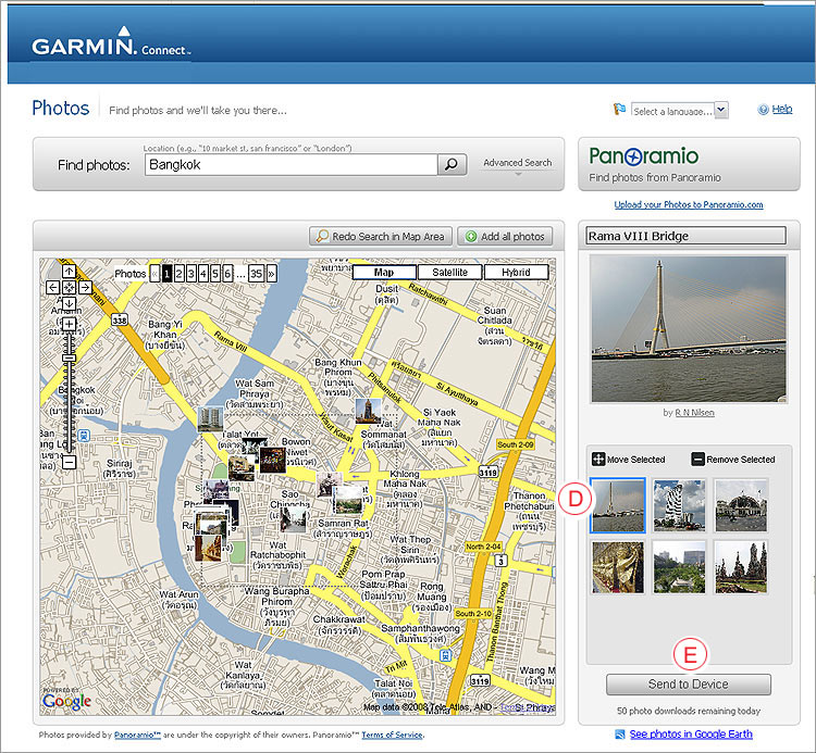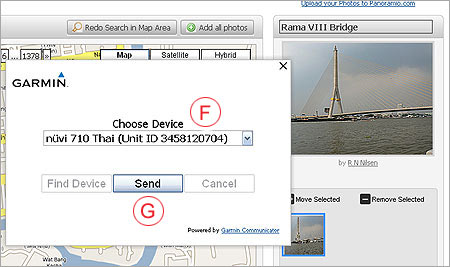เราสามารถเลือกรูปสถานที่ต่างๆ จากที่ใดก้ได้มารวมๆกันไว้ ซึ่งจะ ปรากฎ ตาม (D) ตามรูปที่ 2 ในการส่งรูปไปเข้าในเครื่องนำทาง GPS Garmin Nuvi 710 นั้น ก่อนอื่น จะต้องต่อเครื่อง Garmin เข้ากับคอมพิวเตอร์โดยสาย USB ซึ่งคอมพิวเตอร์จะค้นหา เครื่องก่อน จากนั้น เราก็เลือกรูปที่ต้องการนำไป ใช้นำทาง เช่นรูปสะพานพระราม 8 โดยคลิกที่ (D) จากนั้นก็คลิก (E) Send to Device |