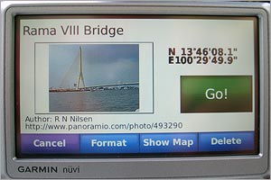ซึ่งในที่นี้ ได้พบเครื่อง Nuvi 710 Thai (F) จากนั้น กด Send (G) ก็เป็นอันเสร็จ การส่งภาพถ่ายที่มี Geocoded ไปยังเครื่องนำทาง Garmin Nuvi 710 (รูปที่ 3) ซึ่งหน้าจอการนำทาง แสดงได้ตามรูปที่ 4 ![]() รูปที่ 4 |
