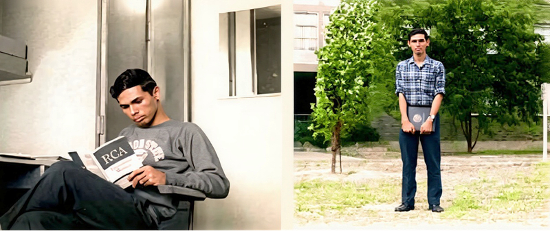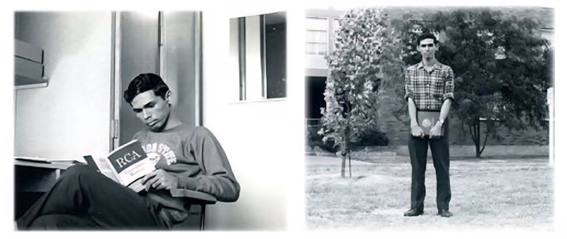 ถ่ายขณะกลับจากการไปใช้เครื่องคอมพิวเตอร์ IBM 1620 จะเห็นว่าหอบ กล่องใส่ Punch Cards เอาไว้ (ถ่ายเมื่อ 20 ธ.ค. 2506) ส่วนภาพทางขวา ถ่าย ณ บริเวนด้านหลังหอพัก |