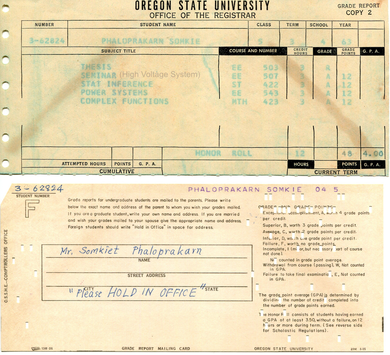 เรื่องที่เขียนเล่ามานี้ ไม่ได้จะคุยว่าเรียนเร็ว แต่เพราะความจำเป็นและมีความบีบคั้นอย่างมากเนื่องจากยังไม่ทันครบกำหนดให้ทุน ก็มีจดหมายมาจากสำนักงาน AID ที่กรุง Washington DC แจ้งให้ผมเดินทางกลับไปรายงานตัวพร้อมทั้งส่งตั๋วเครื่องบินมาให้ด้วย ซึ่งเขาก็ทำเกินไป ไม่เป็นไปตามที่ตกลงกัน ซึ่งผมได้เขียนจดหมายมาถึงผู้บังคับบัญชาที่ทำงานแจ้งว่า ผมยังเรียนไม่จบและก็ยังไม่ได้ไปดูงานตามที่ตกลงกันทำไมรีบร้อนจะให้ผมกลับ ต่อมาเมื่อเรียนจบแล้ว ผมกลับมาประเทศไทย ก็ได้ไปแจ้งแบบฟ้องไปกับผู้ที่ให้ทุนอีกด้วย ความบีบคั้นดังกล่าวทำให้ผมทำวิทยานิพนธ์เสร็จ พร้อมทั้งเรียนครบตามที่ Advisor กำหนด ในภาคฤดูร้อน ซึ่งปกติไม่ค่อยมีคนเรียนเท่าไรนัก เพราะมันร้อน ห้องพักและชั้นเรียนไม่มีแอร์ เวลาดูหนังสือต้องเปิดประตูห้องระบายลม ใช้คอมพิวเตอร์ก็ต้องมีพัดลมตัวโตเป่า CPU และผมก็ใช้ Mainframe จนมันร้อนจัดเสียไปครั้งหนึ่ง รวมเวลาที่อยู่ในเมือง Corvallis 11 เดือนเต็ม และก่อนอำลาจาก Corvallis ได้มีนักเรียนไทยที่ไปใหม่ๆ มาขอคำแนะนำมากมาย ส่วนใหญ่มาขอลอกการบ้านต่างๆเอาไว้ก่อน และต่อมาได้มีผู้สนใจไปศึกษาต่อที่ OSU มากขึ้นและเขาก็รับมากขึ้นด้วย เนื่องจากเกรดที่ผมทำไว้ดี เป็นตัวช่วยในการพิจารณารับคนไทย โดยเฉพาะที่จบจากจุฬาฯ เมื่อตอนที่เรียนจบ ทางอาจารย์ก็ได้ถามว่าอยากจะเรียนต่อทำดอกเตอร์ไหม เพราะเรียนได้ดีแล้ว จะโอนเกรด A ที่ได้จากการเรียนที่บัณฑิตวิทยาลัยให้ และให้ทำวิทยานิพนธ์เรื่องเดิมขยายต่อออกไปอีก และทาง OSU ก็มีงานให้ทำด้วย เช่น เป็น Tutor หรือช่วยสอน แต่ด้วยสัญญาที่มีกับหน่วยงานและกับทาง AID เขาไม่ยอมให้อยู่ต่อ ดังนั้นผมจึงต้องเดินทางกลับ นับว่าได้พลาดโอกาศที่จะทำ Ph.D ไปตลอดกาล |