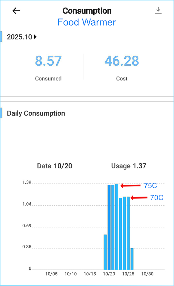 Application ที่ใช้คือ Tuya มีหน้าจอบนโทรศัพท์มือถือที่ดูได้ง่ายและชัดเจน (รูปที่ 12) สำหรับสถิติย้อนหลังนั้นเลือกดูได้เป็นรายวัน รายเดือน และรายปี เมื่อแตะที่แท่งกราฟ ก็จะมีตัวเลขปรากฎขึ้น (รูปที่ 13) |