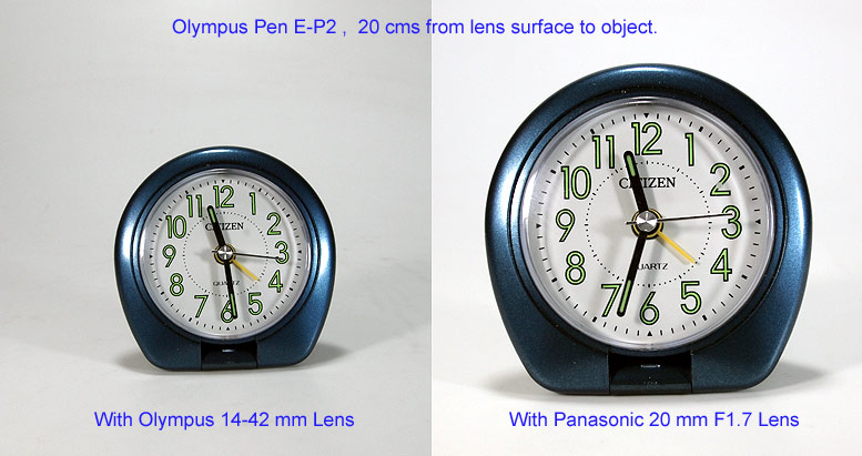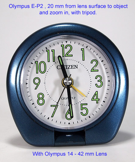 Four-Thirds ในระยะแรกๆ มีเลนส์ให้เลือกใช้น้อย ที่นิยมกัน ก็คือ เลนส์ Olympus 14 - 42 mm, และเลนส์ Pancake ซึ่งมี Olympus 17 mm F2.8 และเลนส์ Panasonic 20 mm F1.7 การถ่ายภาพด้วยเลนส์ ดังกล่าวข้างต้น มีระยะโฟกัสใกล้ที่สุด 20 ซม. ซึ่งแตกต่างจากกล้องคอมแพค ที่ส่วนมากจะถ่ายภาพมาโครได้ที่ระยะโฟกัสสั้นที่สุดเพียง 1 ซม. ดังนั้น ผู้ที่ใช้กล้องระบบ Micro Four-Thirds ก็จะต้องคิดเสียว่า มันคือกล้องที่คล้ายๆกับกล้อง SLR ถ้าหากจะถ่ายภาพมาโคร ก็จะต้องหา เลนส์มาโคร มาใช้ ซึ่ง ในขณะนี้ยังหายาก และอาจต้องใช้ Adapter และเลนส์มีราคาแพง คงจะไม่ค่อยคุ้มค่าการลงทุน ดังนั้นเราลองมาดูว่าเลนส์ที่มีอยู่จะนำมาใช้ถ่ายภาพใกล้ๆได้ดีแค่ไหน จากการทดลอง ตั้งกล้อง Olympus E-P2 บนขาตั้งกล้อง จัดภาพที่จะถ่าย ให้อยู่ห่างจากหน้าเลนส์ 20 ซม. รูปซ้าย ข้างล่างนี้ ใช้เลนส์ Olympus 14 - 42 มม. และ รูปล่างขวา ใช้เลนส์ Panasonic 20 มม. F1.7 ซึ่งเป็นแบบ Fixed Lens ซูมไม่ได้ และมีขนาดสั้น ผลที่ได้คือการใช้เลนส์แบบ Pancake ได้ภาพที่ใหญ่ขึ้น และ ใช้ถ่ายภาพระยะใกล้ได้ดี |