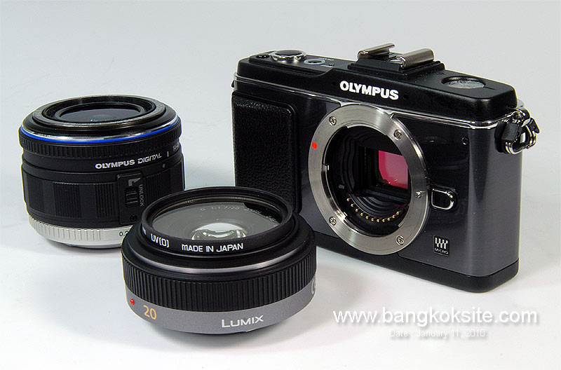 กล้อง Olympus Pen E-P2 และเลนส์ Olympus 14 - 42 มม. และเลนส์ Panasonic 20 มม. F1.7